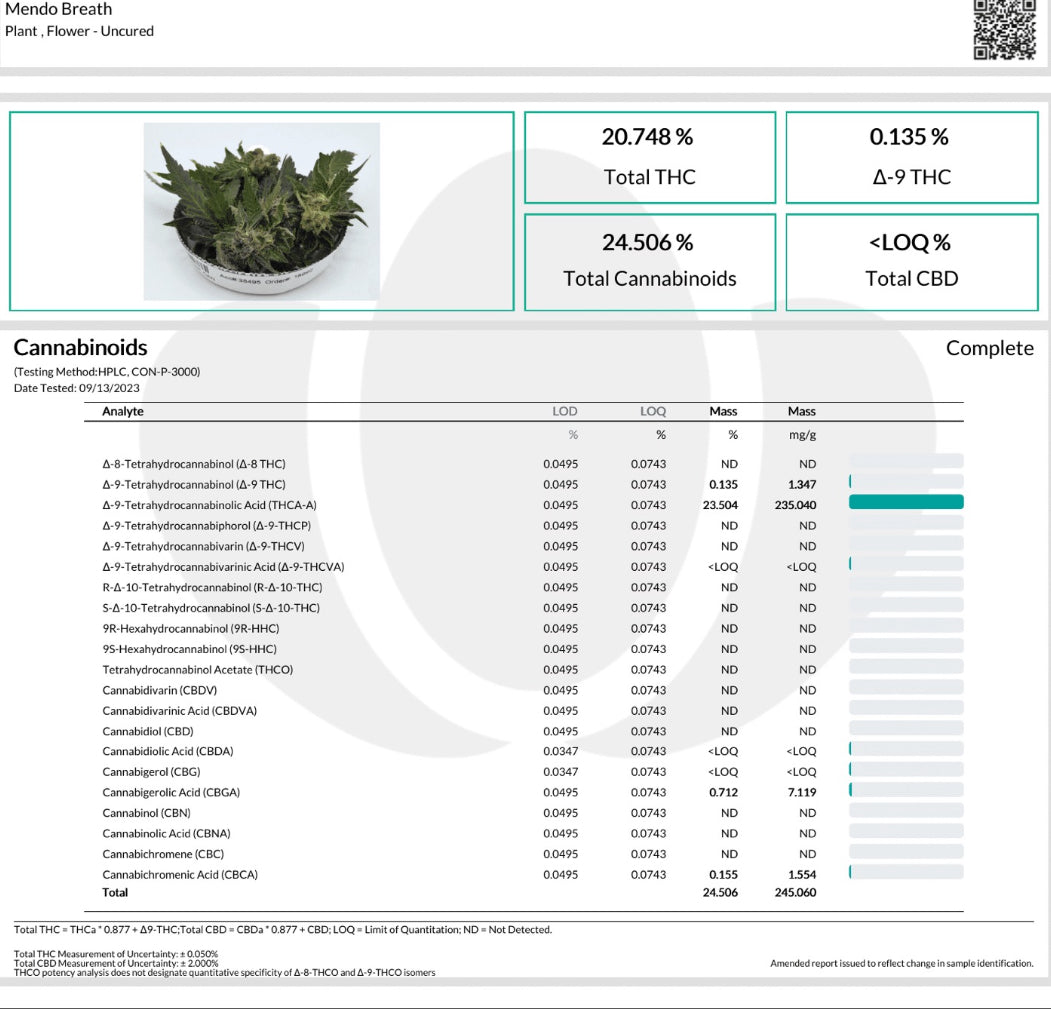 Mendo Breath THCA Flower is characterized by its THCA content and unique aromatic profile. The dense bud structure and trichome richness contribute to its distinct quality.
